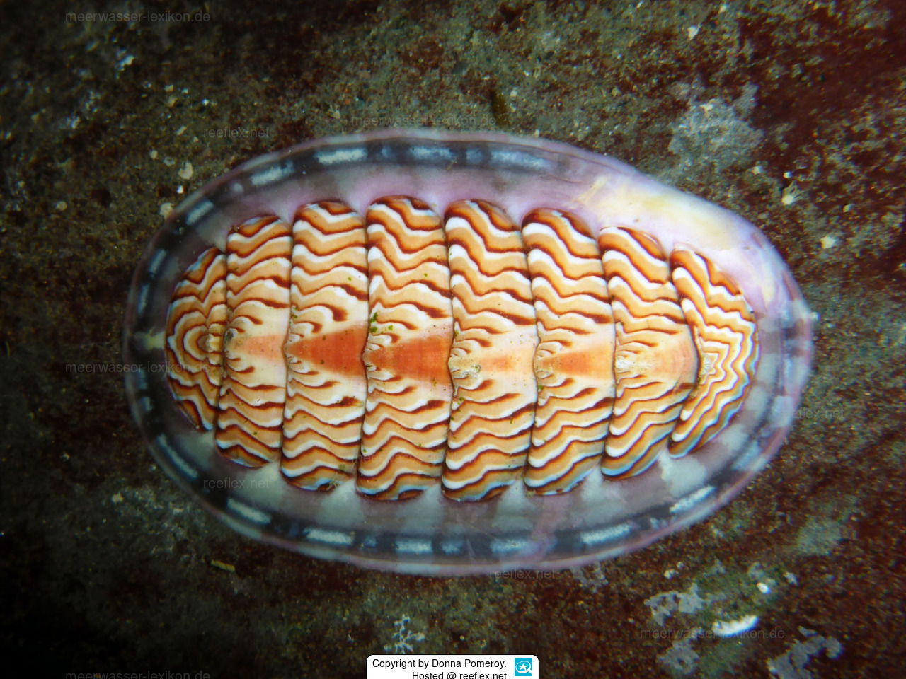 Like most chitons in this genus, Tonicella lokii has blue, white, purple or black zig-zaged lines on each of the eight valves. The background colour of the valves is often brown or red, bright blue or yellow to orange. The girdle is hairless and brown to red or pink.