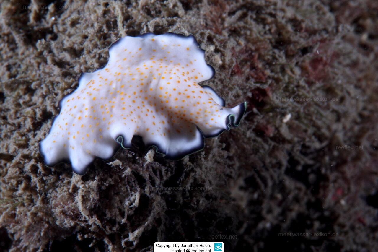 The photo was taken from the Red Sea. This polyclad flatworm with yellow dots on a creamy-whitish groundand a dark marginal band mimic Hypselodoris ghardaqana from the Red Sea . Mimicry has been observed for some polyclad flatworms which are found to mimic distasteful or toxic opisthobranch molluscs.