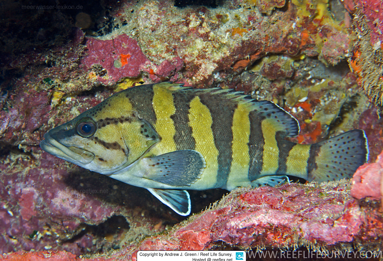 Der benthisch lebende Barsch hält sich gerne in der Nähe von Riffen und auch über sandigen Böden unter Fels- und Korallenüberhängen auf.