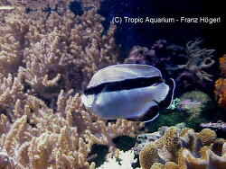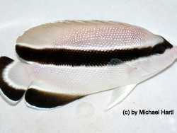 They are overall pale with a broad black bar bordered by a narrow pearly white band running across the upper side from the front of the eye to the posterior portion of the soft dorsal fin. A similar broad black band with pearly white border runs submarginal on the caudal and anal fins.