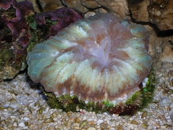 Cynarina lacrymalis is a large polyp stony (LPS) coral, and often referred too as the Doughnut Coral ,Cat's Eye, Tooth, Button, Teary Eye, or Meat Coral. Cynarina lacrymalis is a round solitary coral, one of the largest single-polyped corals found in nature today, and available in many different color forms from pastel to bright and translucent, to drab variations. Sometimes, it is confused with its closest relative, Scolymia.