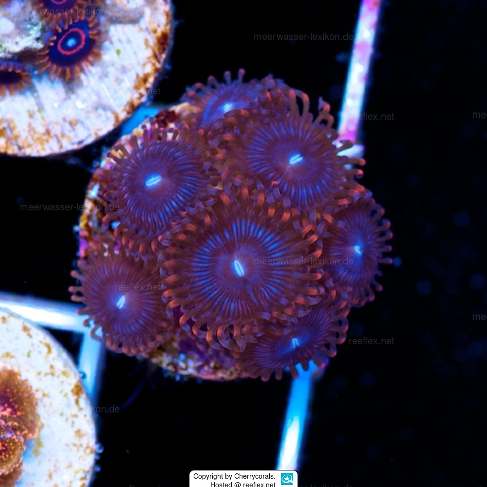 These beautiful Zoanthid or button polyps are sold as Zoanthus „Xmen“ at Local fish Dealers and in online coral Shops. Many thanks by Cherrycorals for the Picture.